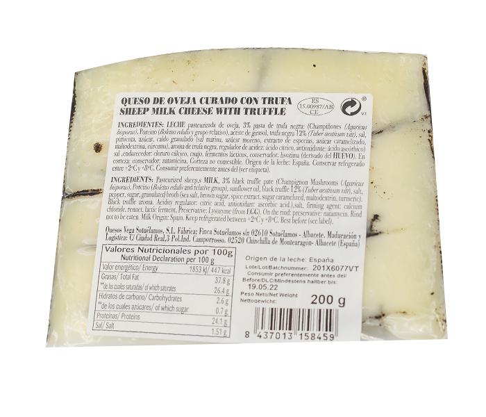 Leche pasteurizada de oveja, sal, cloruro cálcico, cuajo, 3% pasta de trufa, fermento láctico. En corteza : Natamicina.